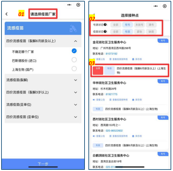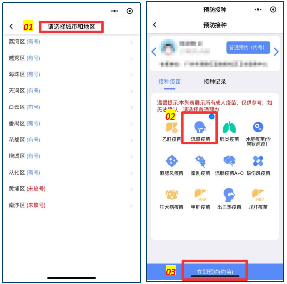 叠加以上操作投入【留神接种管事】(或平直微信搜索“广州市留神接种小身手”)-【儿童/成东谈主预约】-【选拔地区】-【选拔流感疫苗】-【立即预约】