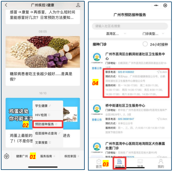 点击【管事指南】-【留神接种管事】-【接种点】-【找到就近社区卫生管事中心】-【检察关连神气、预约神气、管事本领】